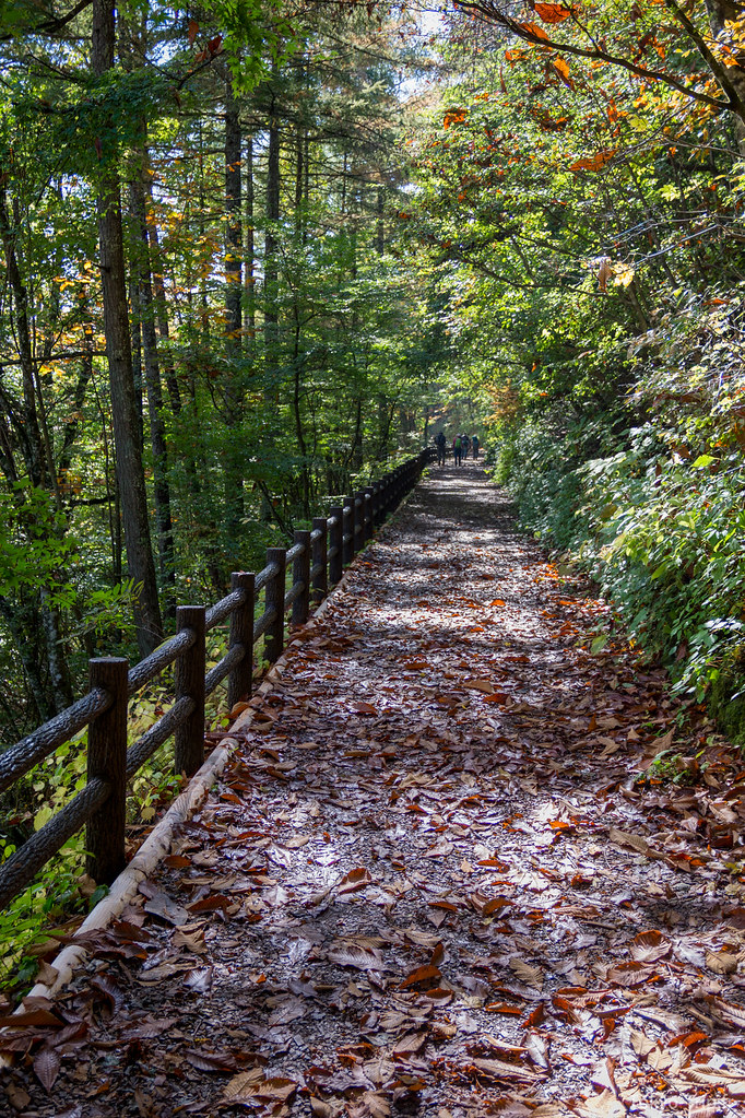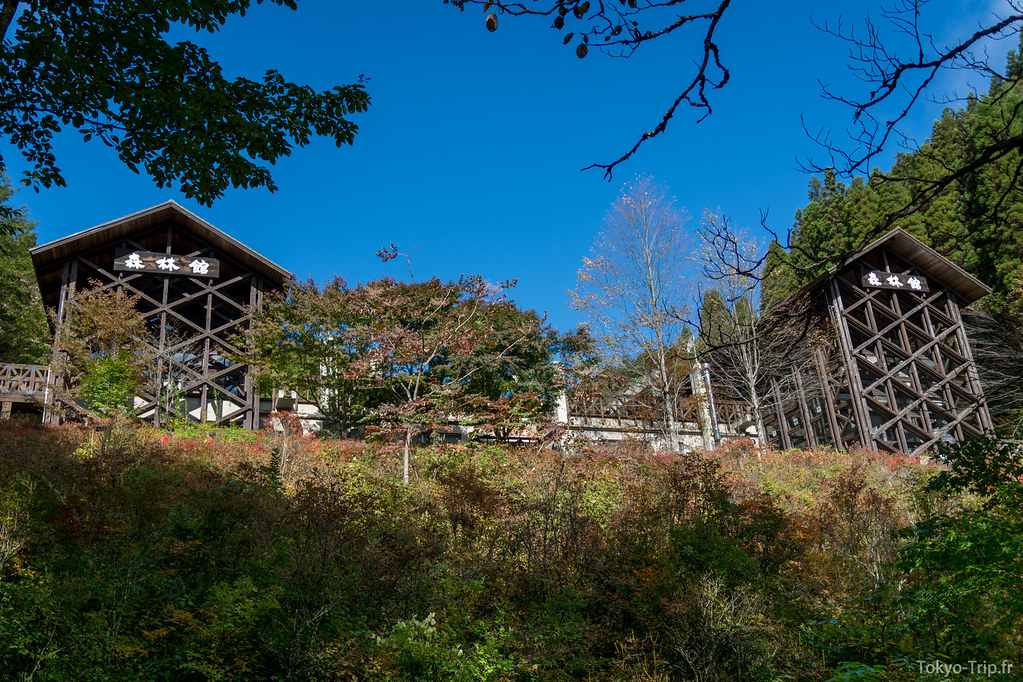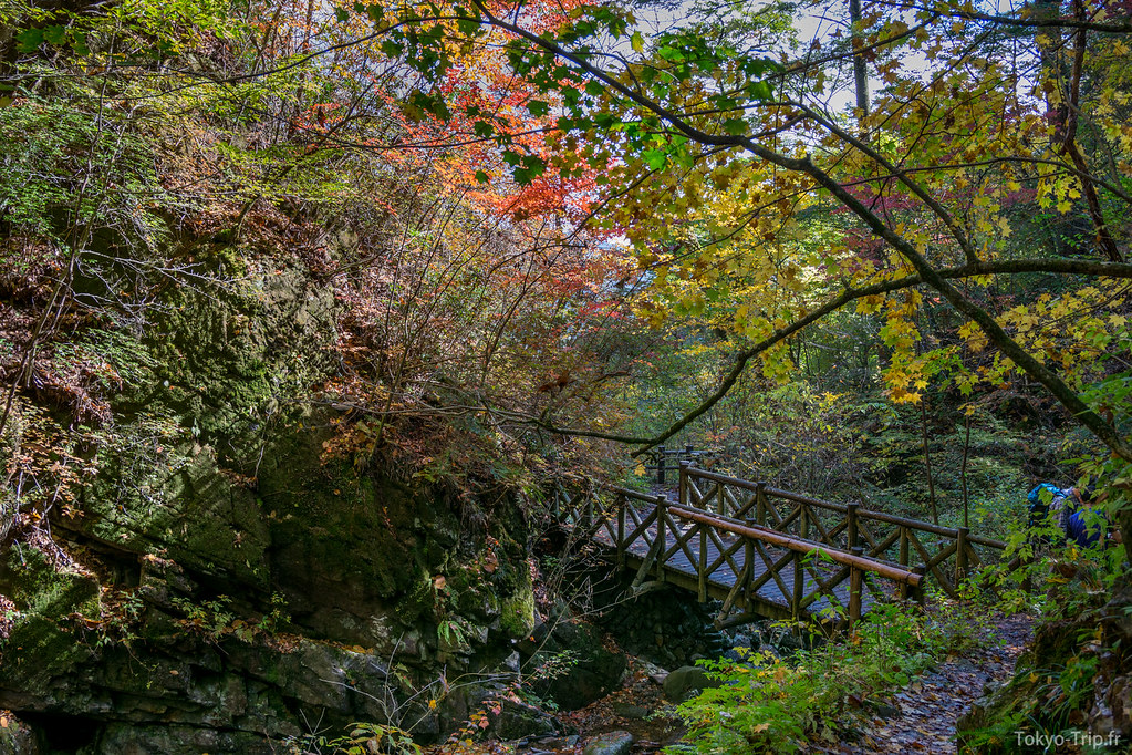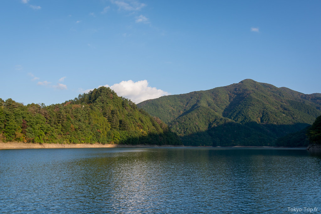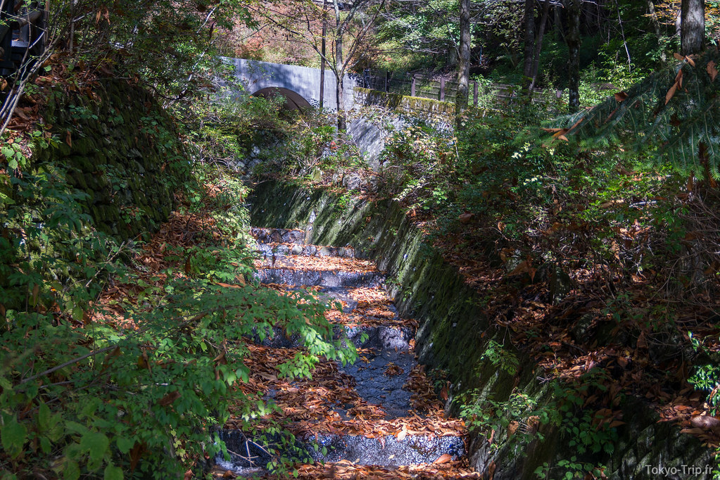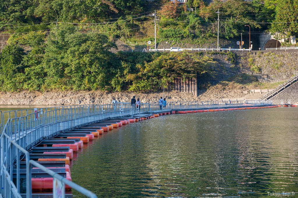 C’est là que les difficultés commencent, le chemin devient un vrai sentier boueux rempli de feuilles mortes. Des pentes glissantes, des passages en rappel au milieu des arbres, ce sont de bons souvenirs, mais sur le coup c’est assez épuisant et l’on se demande quand ça va se terminer. Après 4h de descente, nous sommes finalement arrivés au lac qu’il est possible de traverser grâce à un pont mobile. De l’autre côté du lac se trouve directement un arrêt de bus qui nous ramène directement à la station de Okutama. La région est assez fournie en temple shinto et onsen, n’hésitez pas à vous y arrêter avec de rentré pour vous changer les idées.