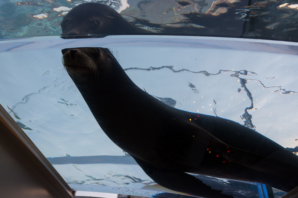Malheureusement pour moi, les loutres pour lesquelles j’étais venu ne font qu’une représentation en plein air le dimanche, et nous sommes arrivés trop tard. Je n’ai donc pu les voir qu’à travers des plaques de plexi un peu sales. Elles étaient fort mignonnes, mais pas possibles de faire de photos correctes dans ces conditions …